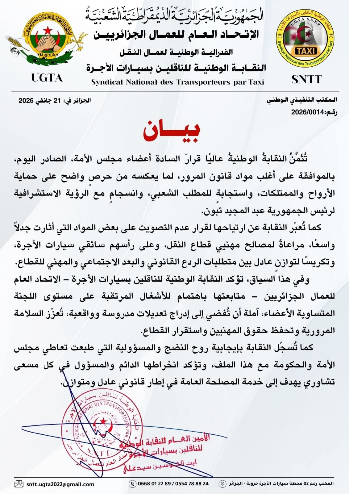 كما رحبت النقابة بالموافقة على أغلب مواد قانون المرور، مضيفة أنه "يعكس الحرصٍ الواضح على حماية الأرواح والممتلكات، واستجابةٍ للمطلب الشعبي، وانسجامٍ مع الرؤية الاستشرافية لرئيس الجمهورية عبد المجيد تبون".