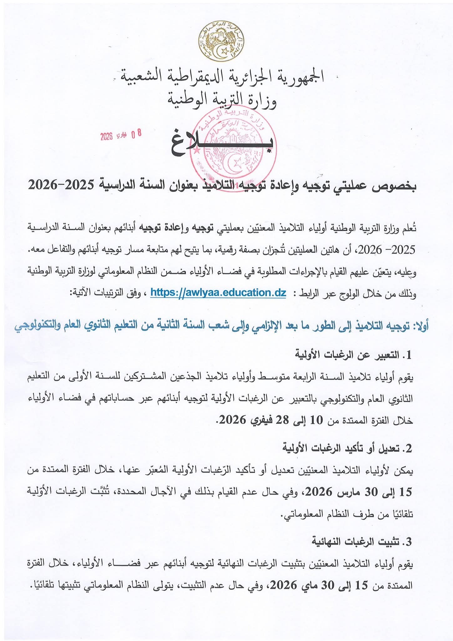 بالنسبة للتعبير عن الرغبات الأولية، يقوم أولياء تلاميذ السنة الرابعة متوسط وأولياء تلاميذ الجذعين المشتركين للسنة الأولى من التعليم الثانوي العام والتكنولوجي بالتعبير عن الرغبات الأولية لتوجيه أبنائهم عبر حساباتهم في فضاء الأولياء خلال الفترة الممتدة من 10 إلى 28 فيفري 2026.