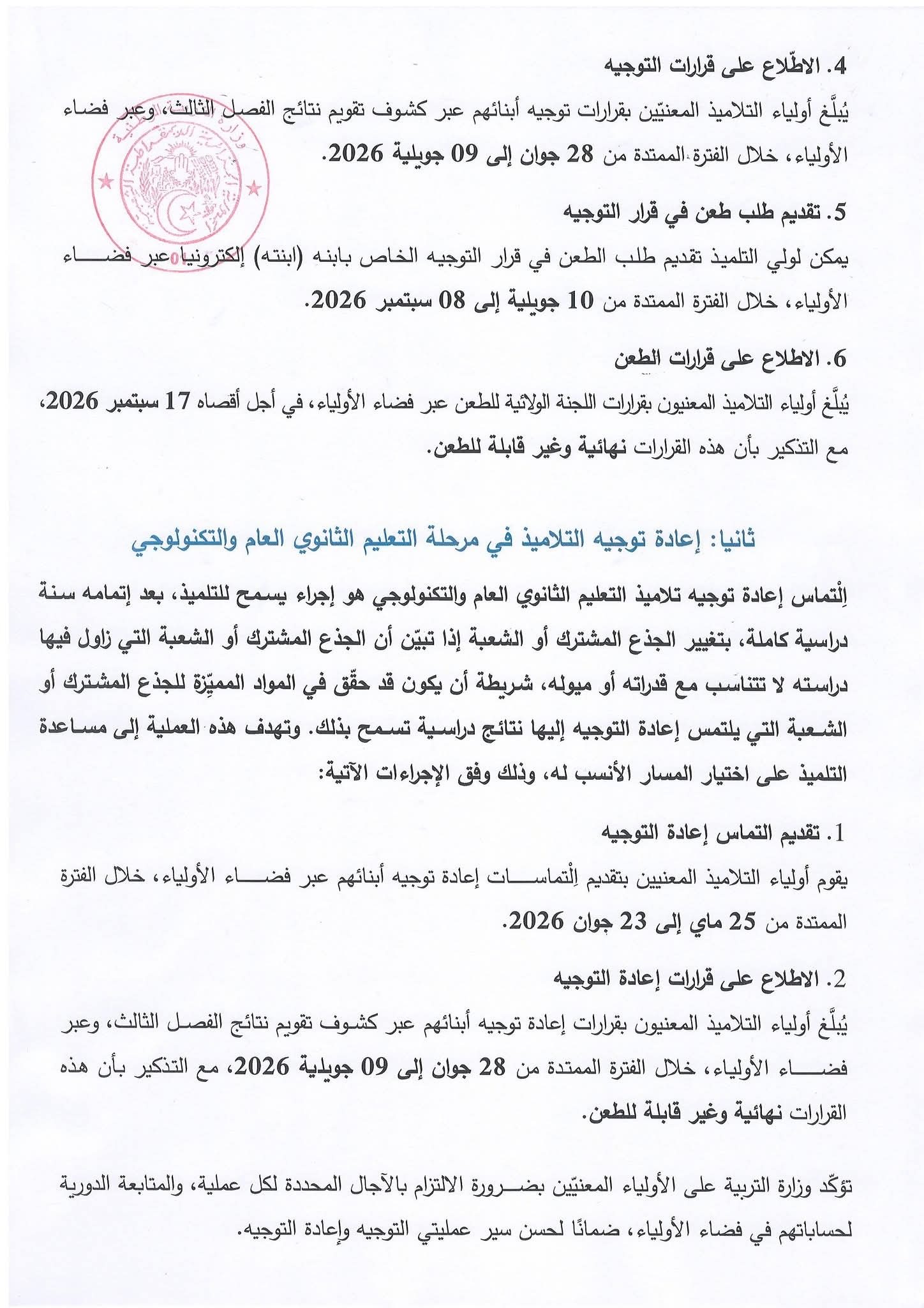 وبخصوص الاطلاع على قرارات التوجيه، يُبلغ أولياء التلاميذ المعنيين بقرارات توجيه أبنائهم عبر كشوف تقويم نتائج الفصل الثالث، وعبر فضاء الأولياء، خلال الفترة الممتدة من 28 جوان إلى 09 جويلية 2026.