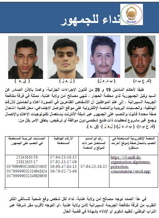 وأنهت مصالح أمن ولاية عنابة ممثلة في فرقة مكافحة الجريمة السيبرانية، إلى علم المواطنين أن الأشخاص الظاهرين في الصورة والحاملين للأرقام الهاتفية والحسابات البريدية والمنصة الالكترونية على مواقع التواصل الاجتماعي محل قضية انتحال صفة محددة قانونا والنصب على الجمهور عبر شبكة الأنترنت باستعمال تكنولوجيات الإعلام والإتصال وجمع غير مشروع المعطيات ذات طابع شخصي دون موافقة أو ترخيص.