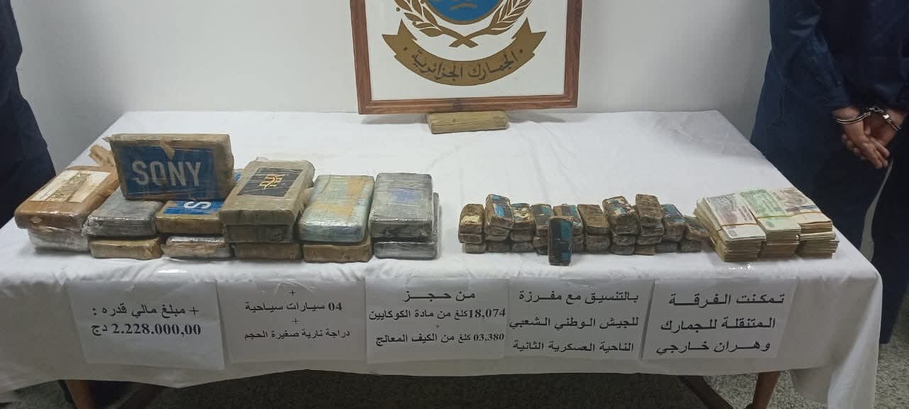 تمكنت الفرقة المتنقلة للتفتيش التابعة لمفتشية أقسام الجمارك بوهران خارجي، وبالتنسيق مع مفرزة للجيش الوطني الشعبي، من حجز 18,074 كلغ من مادة الكوكايين.