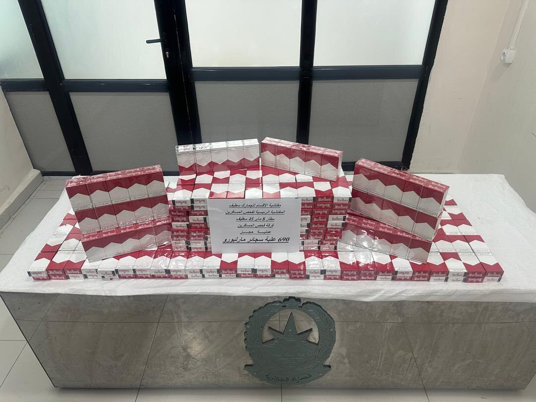 تمكن أعوان المفتشية الرئيسية لفحص المسافرين بالمطار الدولي 8 ماي 1945، التابعة لمفتشية أقسام الجمارك بسطيف، في عمليتين متفرقتين، من حجز 690 علبة سجائر من نوع مارلبورو، كانت مخبأة بأمتعة وحقائب مسافرين اثنين متوجهين نحو مدينة ليون الفرنسية.