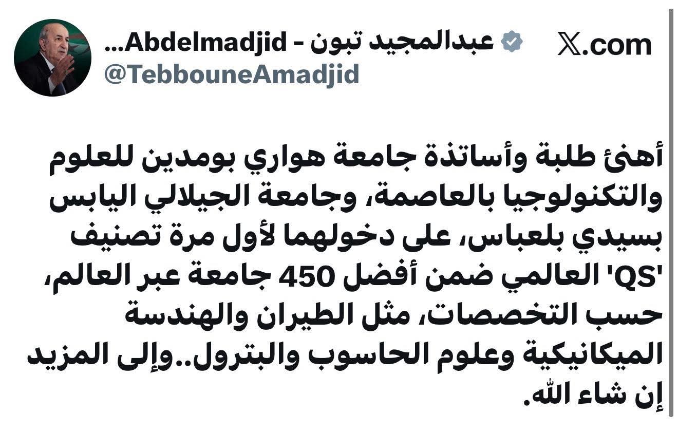 هنأ رئيس الجمهورية عبر حسابه الخاص طلبة وأساتذة جامعة هواري بومدين للعلوم والتكنولوجيا بالعاصمة، وجامعة الجيلالي اليابس بسيدي بلعباس، على دخولهما لأول مرة تصنيف 'QS' العالمي ضمن أفضل 450 جامعة عبر العالم، حسب التخصصات.