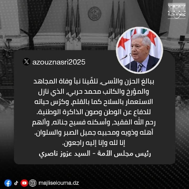 “ببالغ الحزن والأسى، تلقّينا نبأ وفاة المجاهد والمؤرخ والكاتب محمد حربي، الذي نازل الاستعمار بالسلاح كما بالقلم، وكرّس حياته للدفاع عن الوطن وصون الذاكرة الوطنية. رحم الله الفقيد، وأسكنه فسيح جناته، وألهم أهله وذويه ومحبيه جميل الصبر والسلوان… إنا لله وإنا إليه راجعون.”