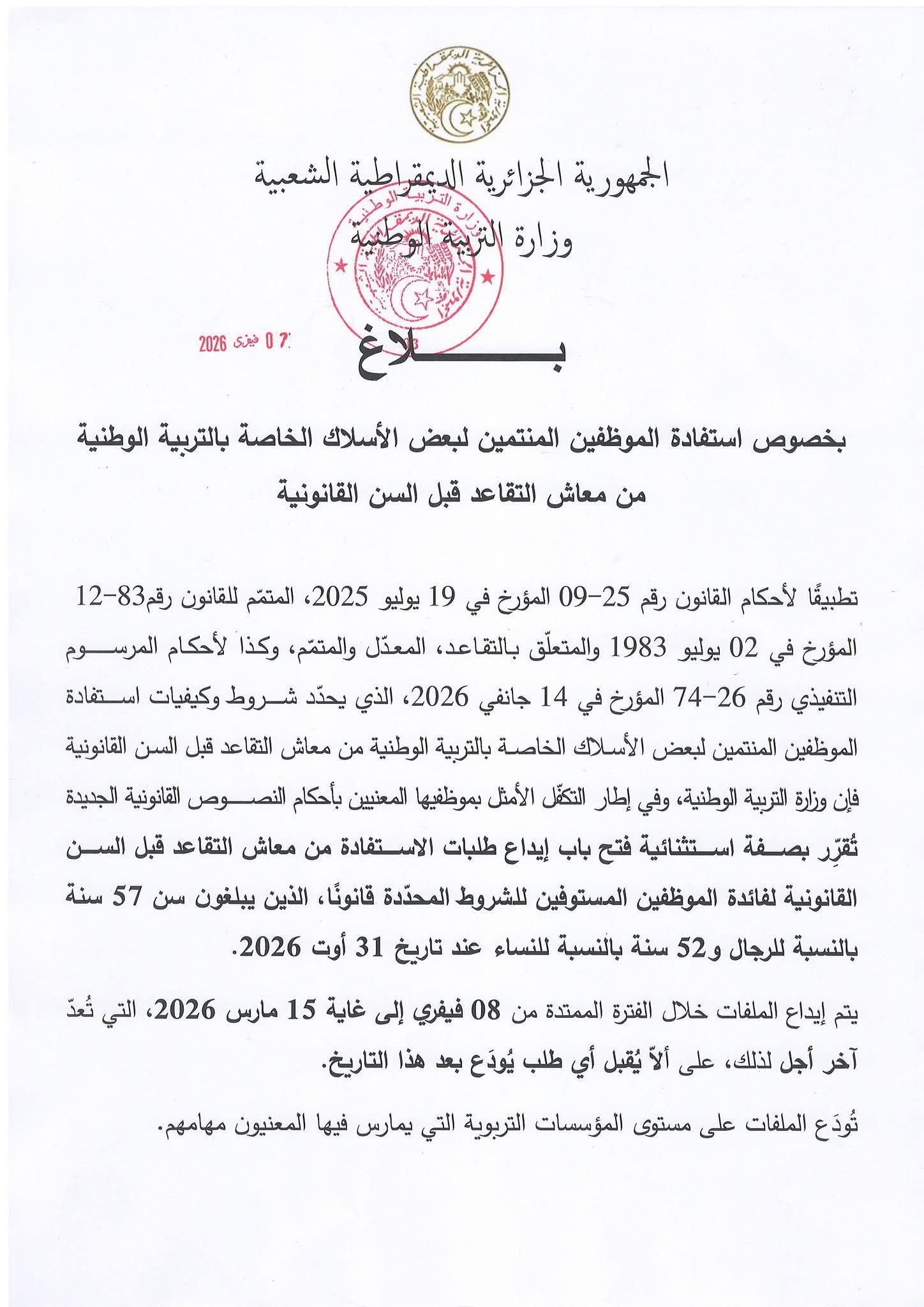 أعلنت وزارة التربية الوطنية، فتح باب إيداع طلبات الاستفادة من معاش التقاعد قبل السن القانونية للموظفين المنتمين لبعض الأسلاك الخاصة بالتربية الوطنية، استنادًا إلى أحكام القانون رقم 25-09 المؤرخ في 19 جويلية 2025، المتمم للقانون رقم 83-12 المؤرخ في 02 جويلية 1983، والمتعلق بالتقاعد، إضافة إلى أحكام المرسوم التنفيذي رقم 26-74 المؤرخ في 14 جانفي 2026، الذي يحدد شروط وكيفيات الاستفادة من هذا الحق.
