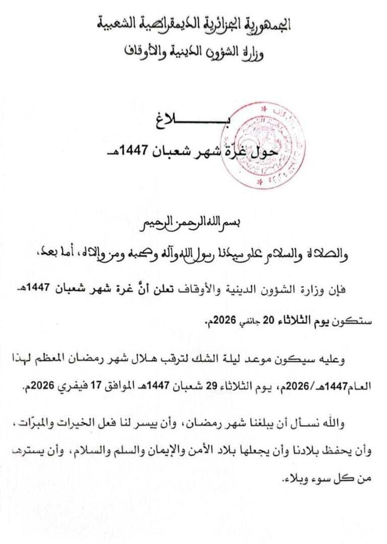 أعلنت وزارة الشؤون الدينية والأوقاف أن غرة شهر شعبان 1447هـ ستكون يوم الثلاثاء 20 جانفي 2026م.