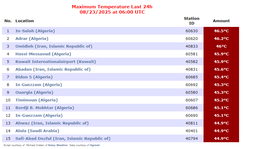 ونشر الموقع المختص في قياس درجات الحرارة “Eldoradowheather” قائمة تضم 15مدينة عبر العالم، جاءت مدينة إن صالح في مقدمتها ترتيبها بحرارة بلغت 46.5 درجات مئوية تلتها مدينة أدرار بـ 46.2 درجة مئوية.