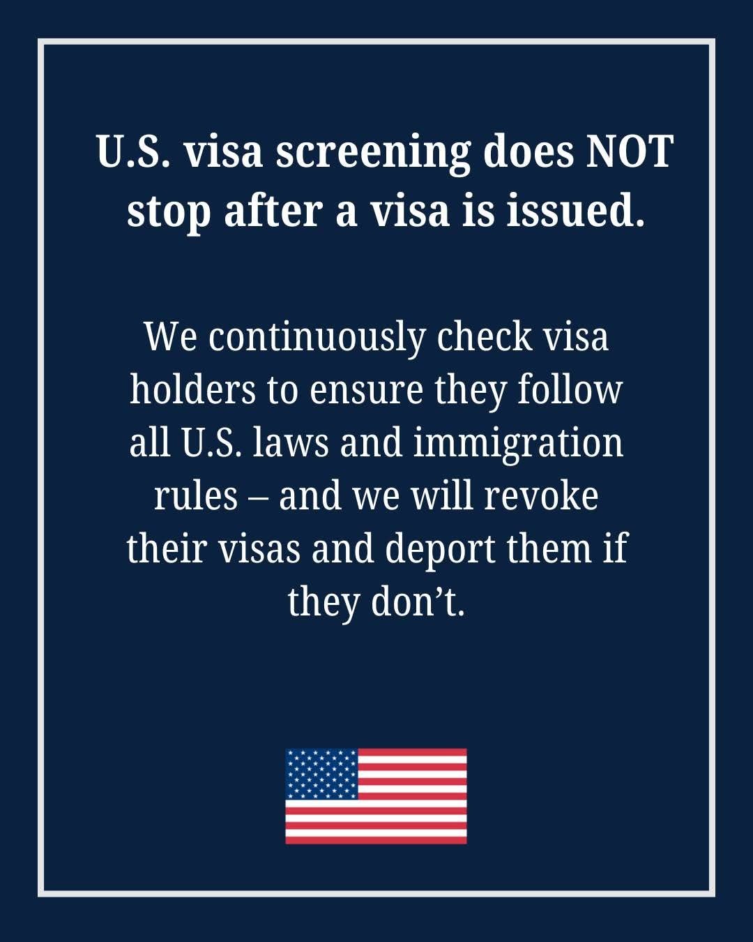 يتمّ التحقق بشكلٍ مستمر من حاملي التأشيرات لضمان الالتزام بجميع القوانين الأمريكية وقواعد الهجرة، كما قد يتمّ إلغاء تأشيراتهم وترحيلهم من الولايات المتحدة في حال عدم الالتزام بذلك”.