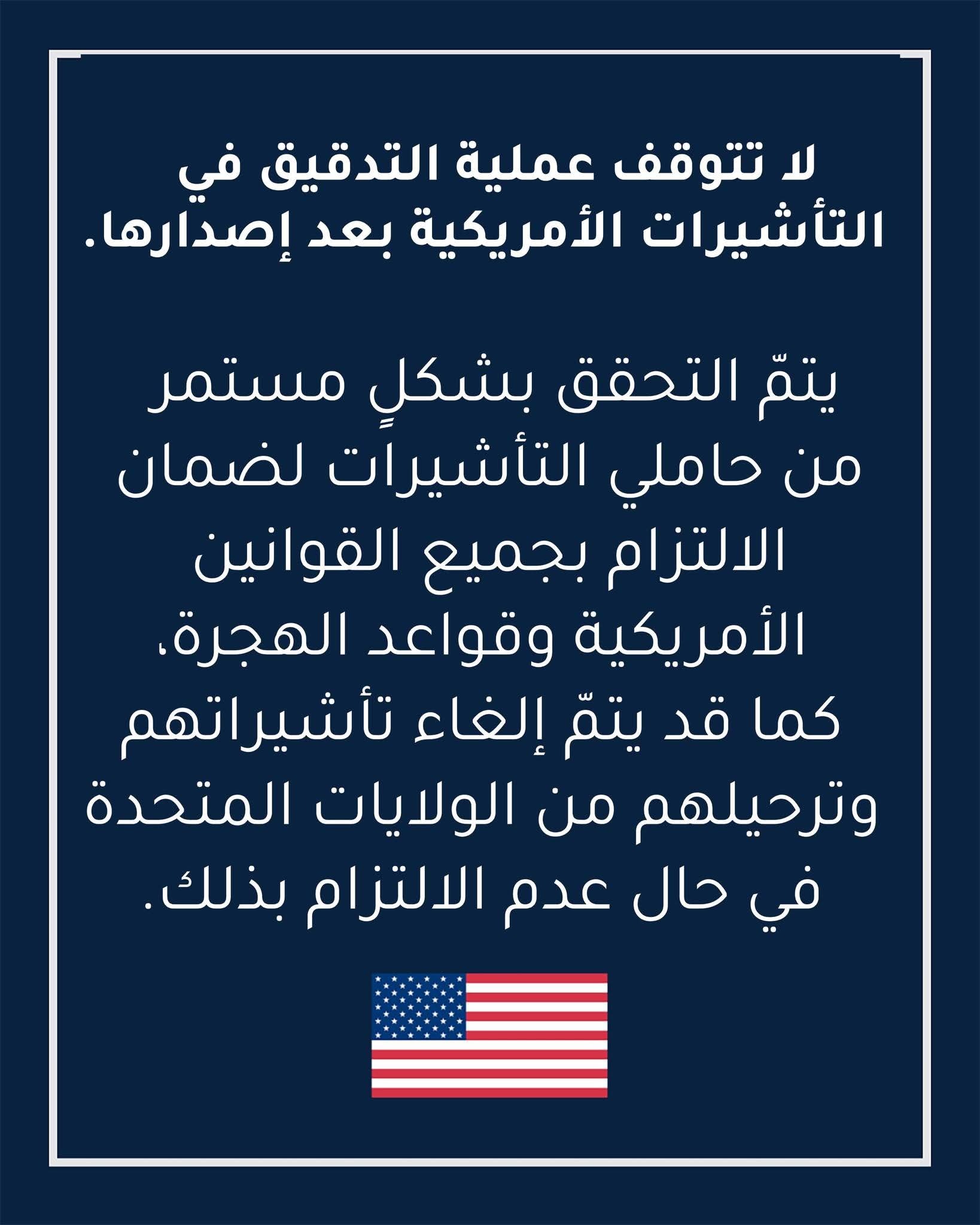 وجاء في بيان للسفارة، نشرته على صفحتها الرسمية بفاسبوك: “لا تتوقف عملية التدقيق في التأشيرات الأمريكية بعد إصدارها.
