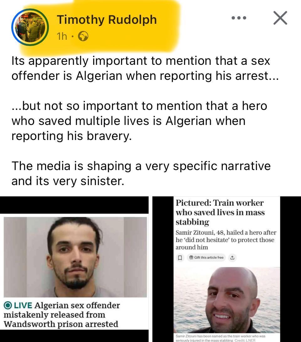 الصورة الأولى التي نشرتها إحدى القنوات البريطانية ركزت على عبارة "Algerian sex offender"، بينما الصورة الثانية لوسيلة إعلامية أخرى تشير إلى عامل قطار "أنقذ أرواحا" دون أي ذكر لخلفيته الجزائرية، رغم تداول اسمه وصورته. هذا التناقض دفع رودولف إلى القول إن الإعلام "يصنع سردية محددة وخطيرة"، مشيراً إلى أن إبراز الجنسية يستعمل فقط عندما يكون الخبر سلبيا.
