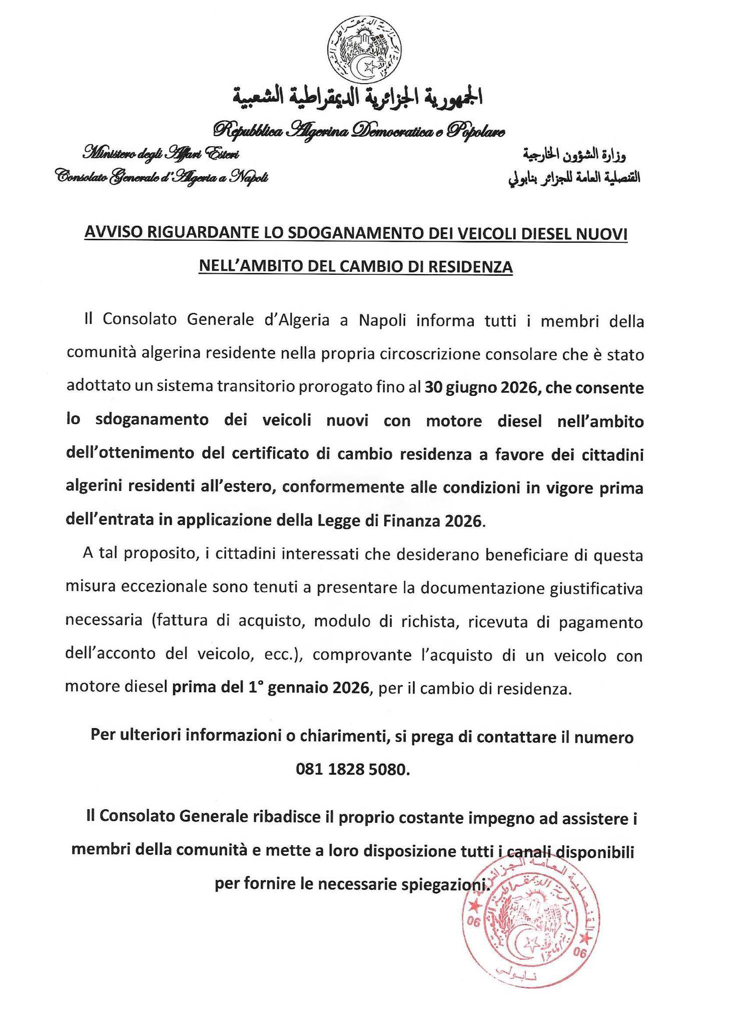 أعلنت القنصلية العامة للجزائر في نابولي بإيطاليا عن اعتماد إجراء استثنائي يخص التخليص الجمركي للسيارات الجديدة التي تعمل بالديزل، وذلك في إطار تسهيل إجراءات تغيير محل الإقامة لفائدة أفراد الجالية الجزائرية.