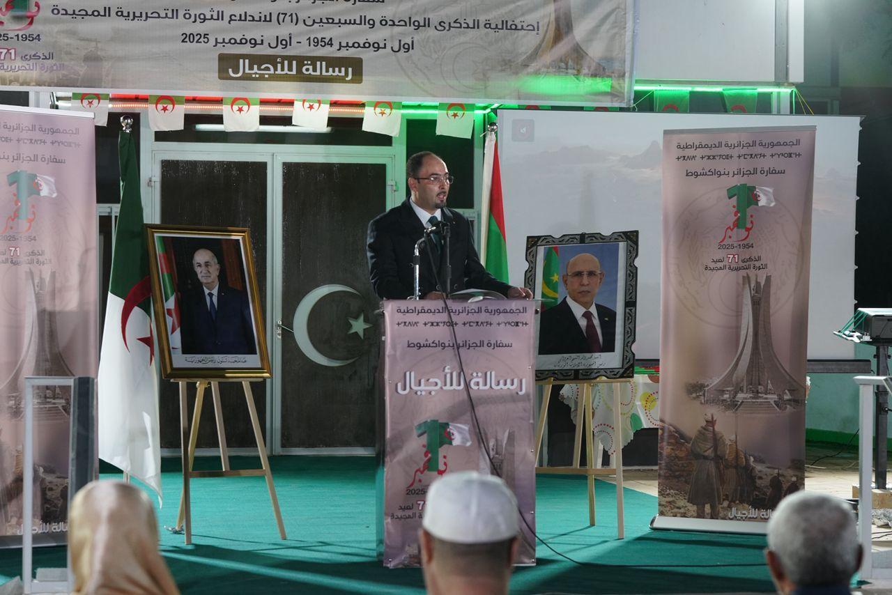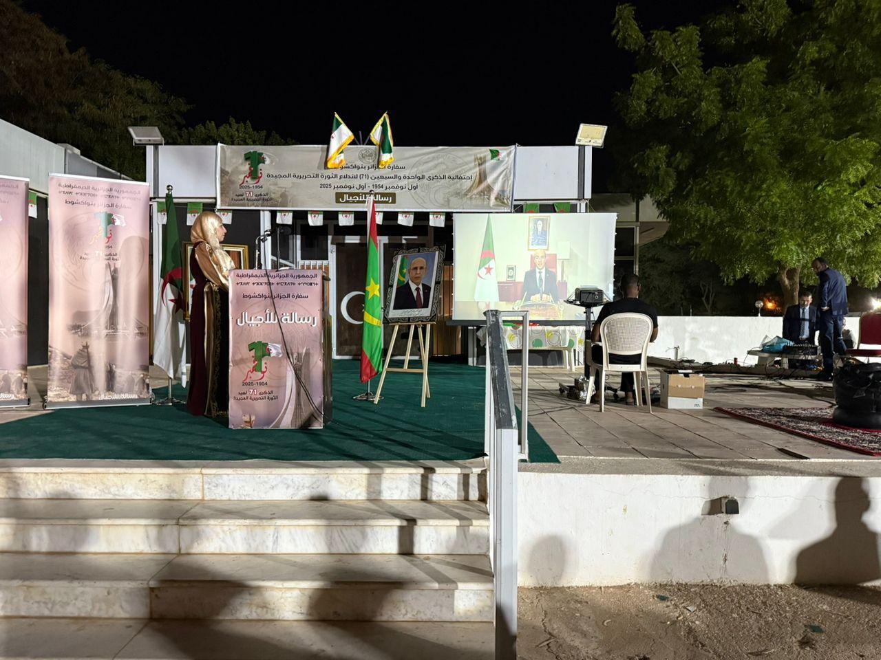 أحيَت السفارة الجزائرية في نواكشوط، مساء الخميس 31 أكتوبر 2025، الذكرى الحادية والسبعين لاندلاع الثورة التحريرية المجيدة، وسط أجواء مفعمة بالفخر والانتماء، بحضور أفراد الجالية الوطنية المقيمة في موريتانيا وعدد من الشخصيات الرسمية والثقافية.