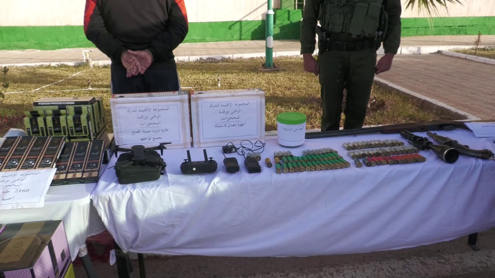 وحسب بيان لذات المصالح، العملية أسفرت عن حجز مسدس آلي ومخزن خاص به، مسدسين تقليديين، بندقية صيد ومنظار خاص بها،طائرة "درون" بجميع لواحقها، أجهزة اتصال لاسلكية، خراطيش وكمية من البارود، كبسولات خاصة بالخراطيش،2547 جهاز مراقبة (كاميرات) من مختلف الأنواع، و2160علبة من البخور أجنبية الصنع.