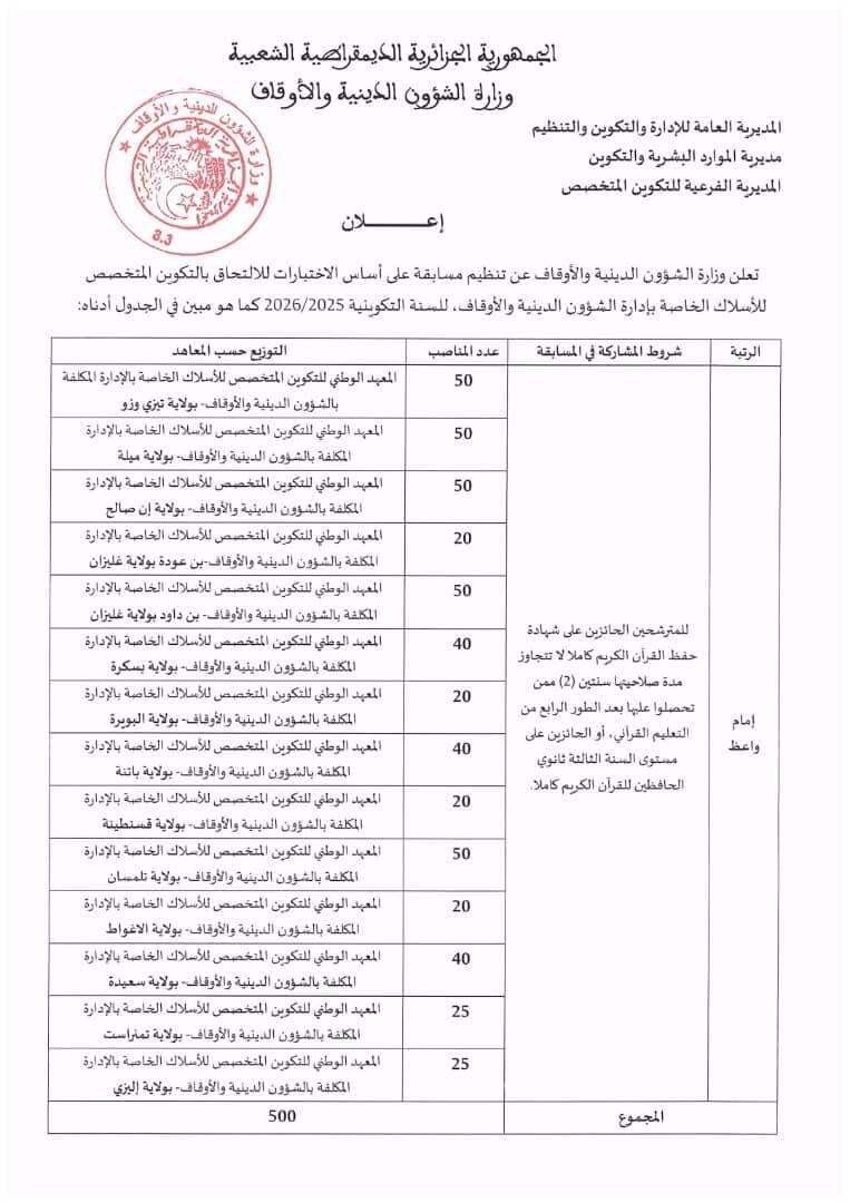 أعلنت وزارة الشؤون الدينية، عن تنظيم مسابقة على اساس الاختبار للالتحاق بالتكوين المتخصص للأسلاك الخاصة بإدارة الشؤون الدينية والأوقاف للسنة التكوينية 2025/2026.