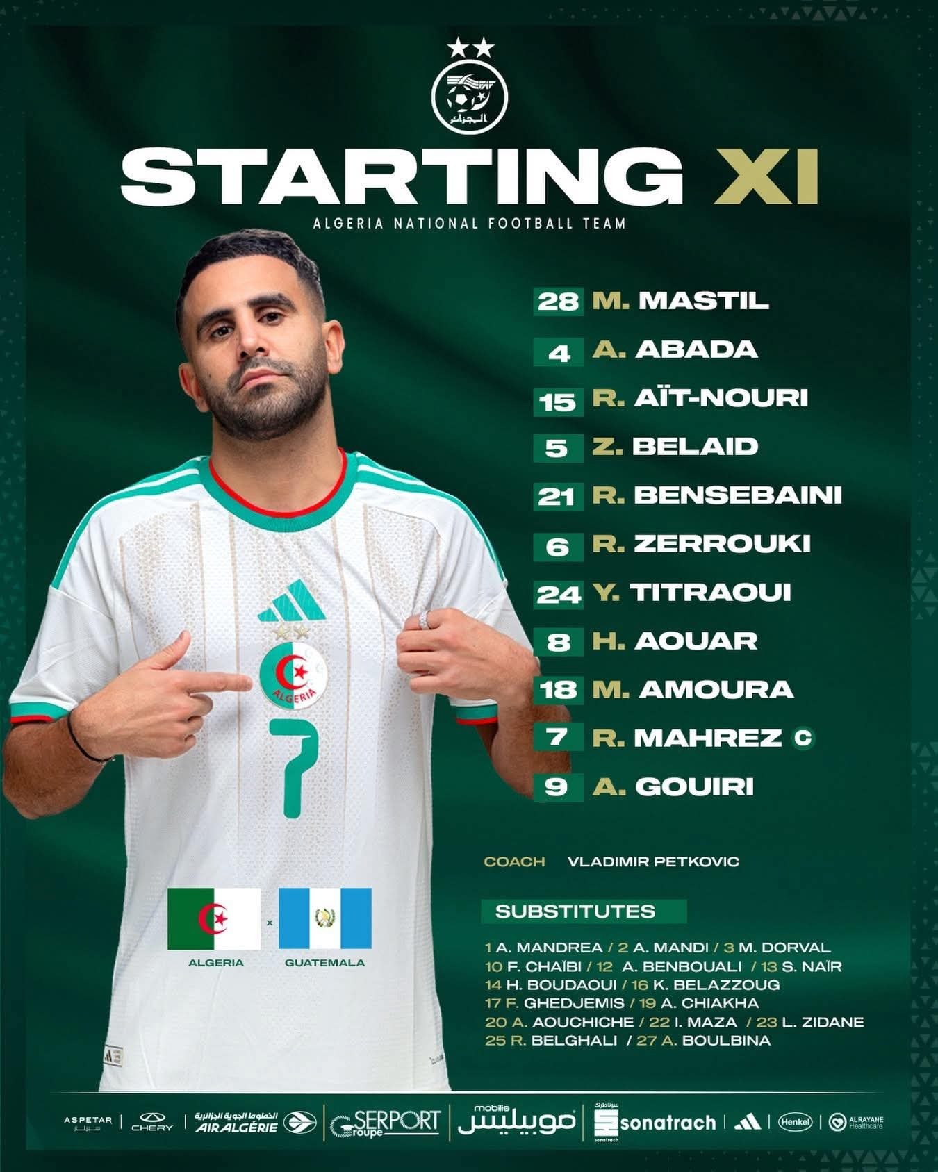 أعلن الناخب الوطني فلاديمير بيتكوفيتش عن التشكيلة الأساسية التي سيعتمد عليها في المواجهة الودية التي ستجري بملعب “لويجي فيراريس” بإيطاليا ضد منتخب غواتيمالا.