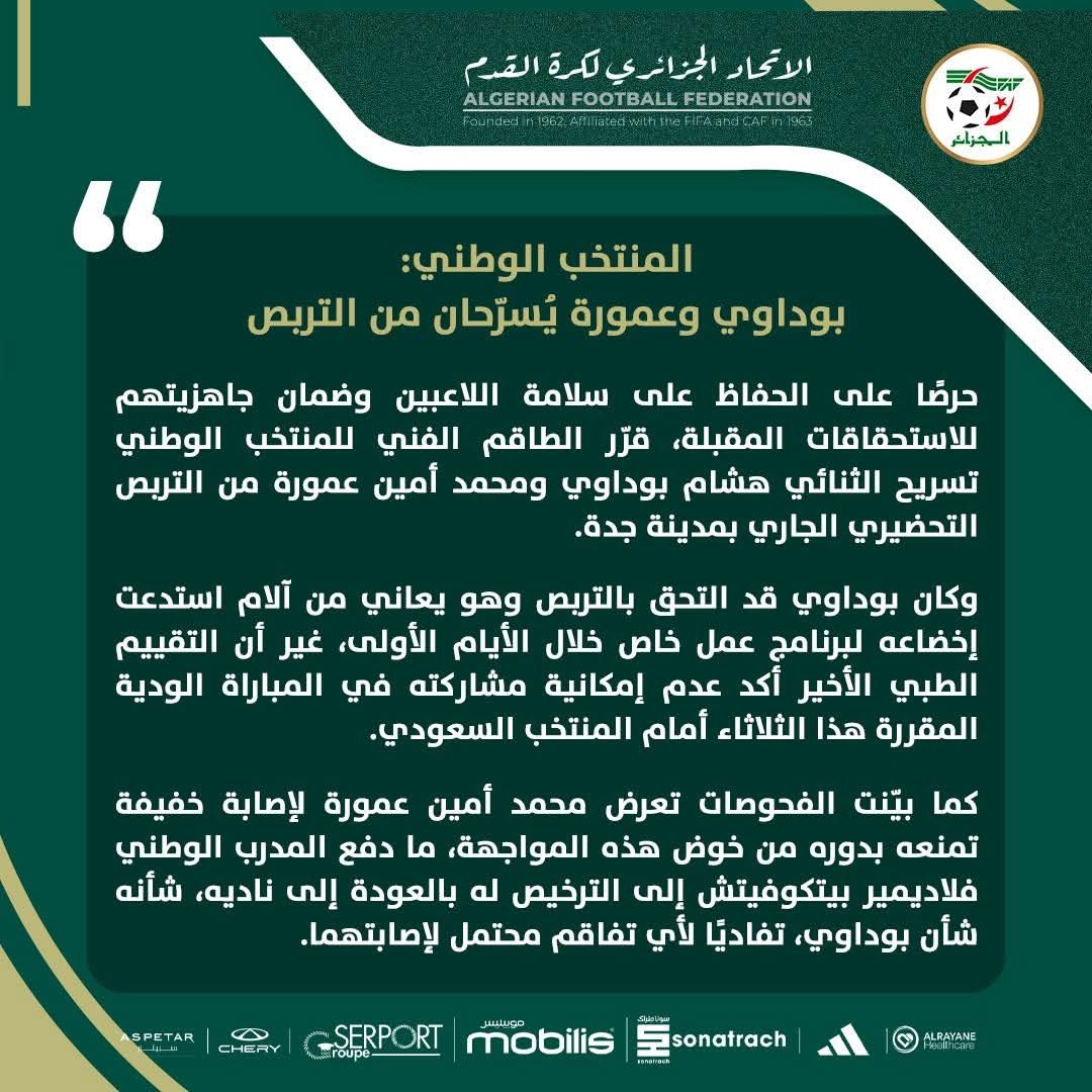 أعلنت الاتحادية الجزائرية لكرة القدم عن تسريح اللاعبين هشام بوداوي ومحمد الامين عمورة من تربص المنتخب الوطني الأول، وذلك حفاظا على سلامتهما ووضمان جاهزيتهما للاستحقاقات المقبلة.
