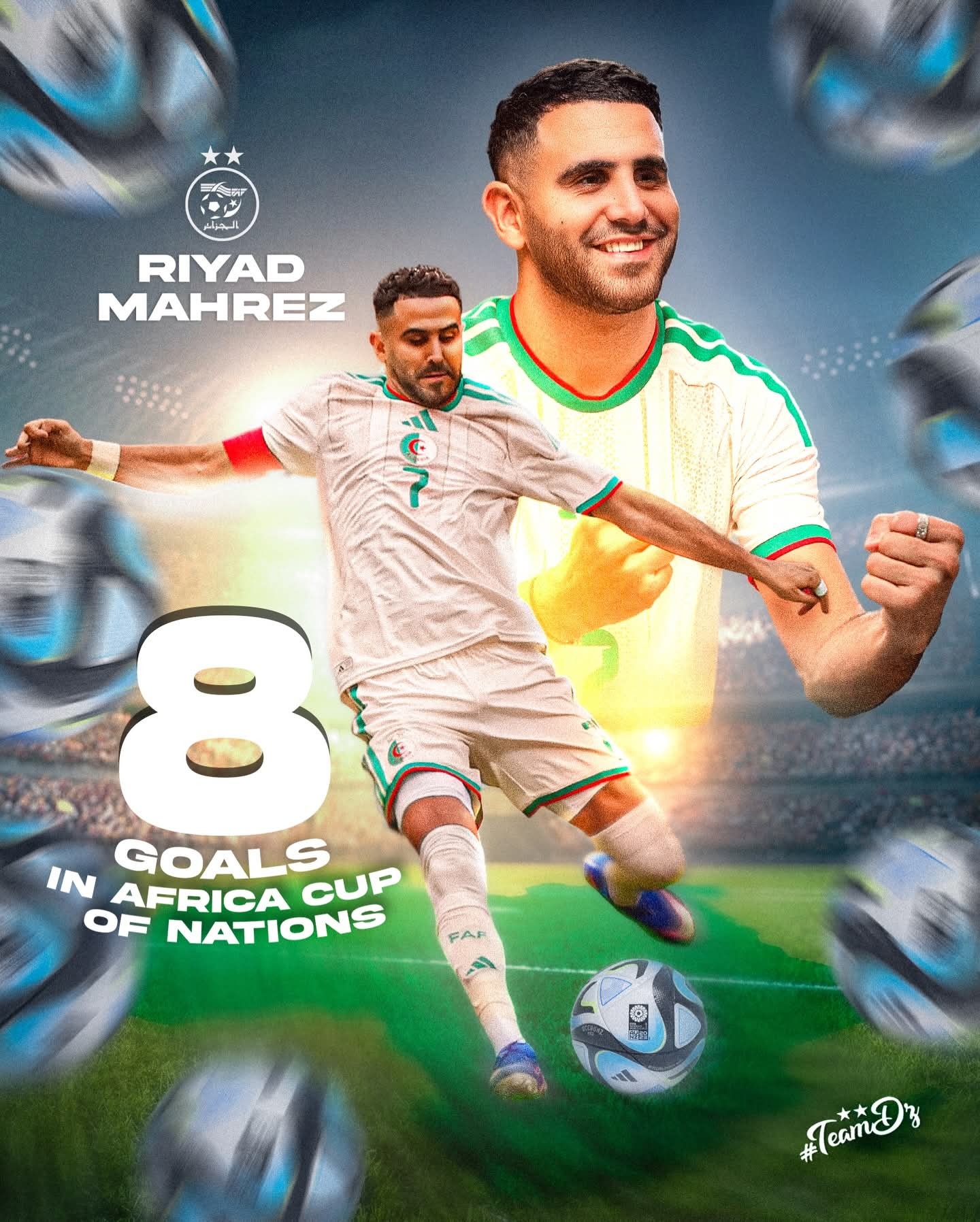 تجاوز نجم المنتخب الوطني رياض محرز الاسطورة لخضر بلومي ليصبح أكثر لاعب تسجيلا للاهداف في تاريخ المنتخب الوطني في كأس افريقيا ب 8 أهداف.