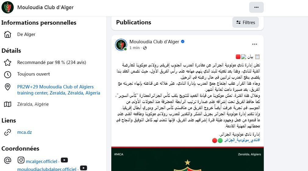 كما أوضحت إدارة النادي العاصمي، بأن القرار جاء عقب اجتماع بين المدرب وإدارة النادي، وعبر خلاله موكوينا، عن قناعته بإنهاء تجربته مع الفريق، بعد مسيرة دامت ثمانية أشهر.