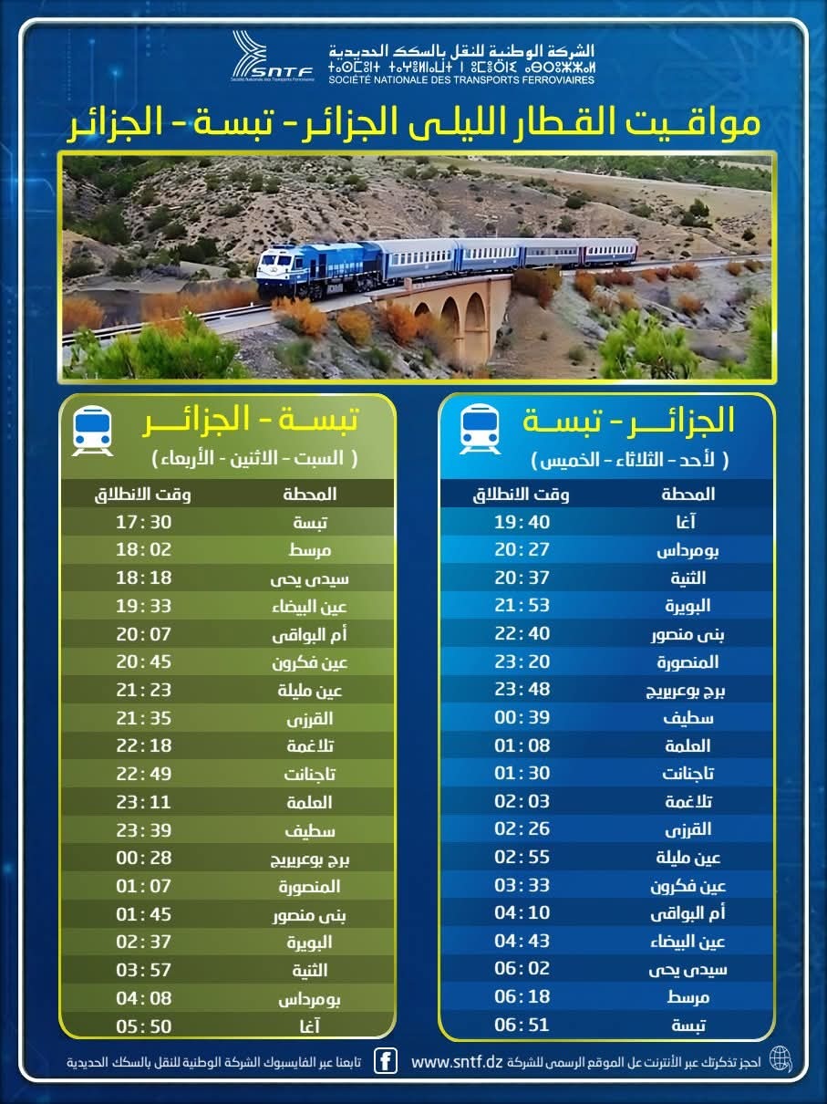 أعلنت الشركة الوطنية للنقل عبر السكك الحديدية، عن مواقيت القطار الليلي “الجزائر - تبسة – الجزائر”.