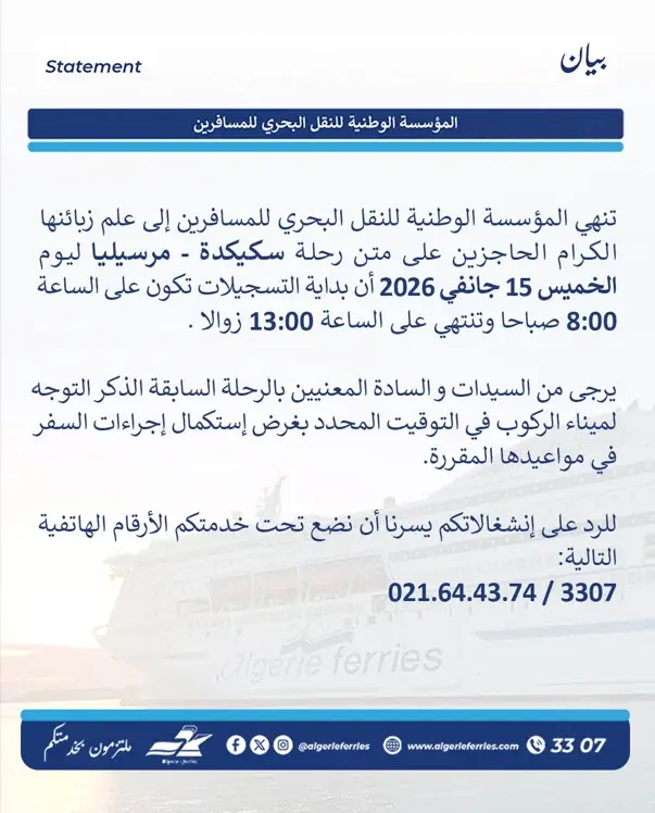 كشفت المؤسسة الوطنية للنقل البحري للمسافرين، عن توقيت التسجيل الخاص بالمسافرين الحاجزين على متن رحلة “سكيكدة – مرسيليا” المبرمجة ليوم الخميس 15 جانفي 2026.