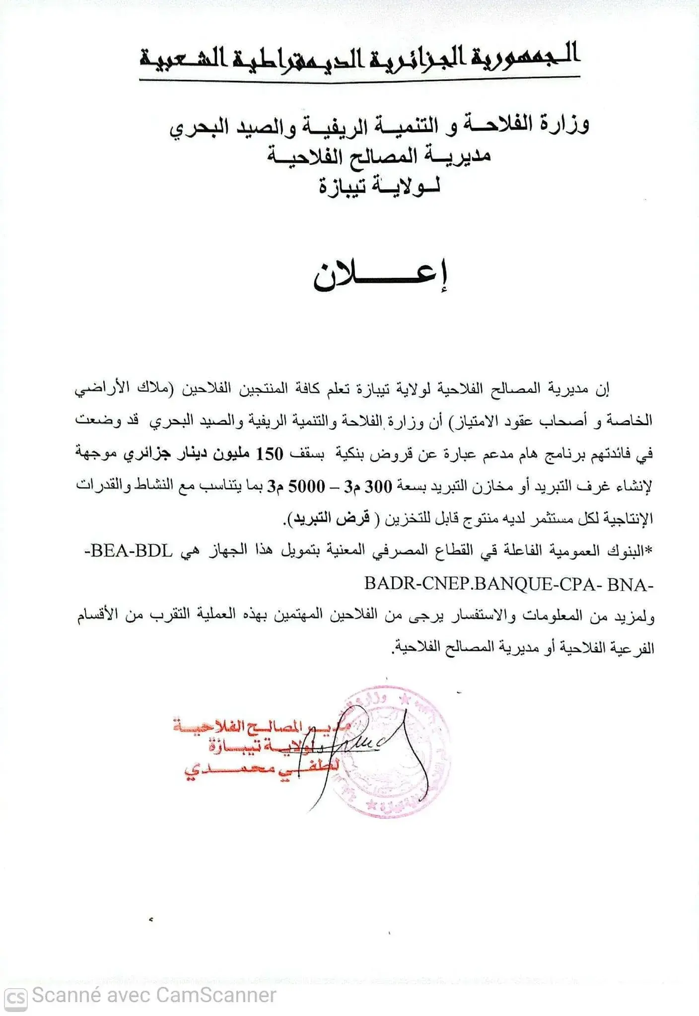 أعلنت مديرية المصالح الفلاحية لولاية تيبازة، وضع قروض بنكية بسقف 150 مليون دينار جزائري، لإنشاء غرف تبريد لكافة المنتجين الفلاحين ملاك الأراضي الخاصة وأصحاب عقود الامتياز.