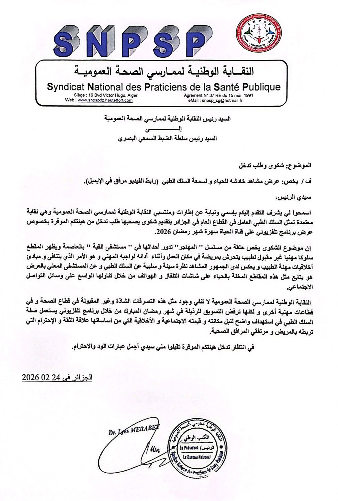 أعلنت النقابة الوطنية لممارسي الصحة العمومية، عن رفع شكوى رسمية إلى سلطة الضبط السمعي البصري، تخص عرض مشاهد تلفزيونية خادشة للحياء ولسمعة السلك الطبي.
