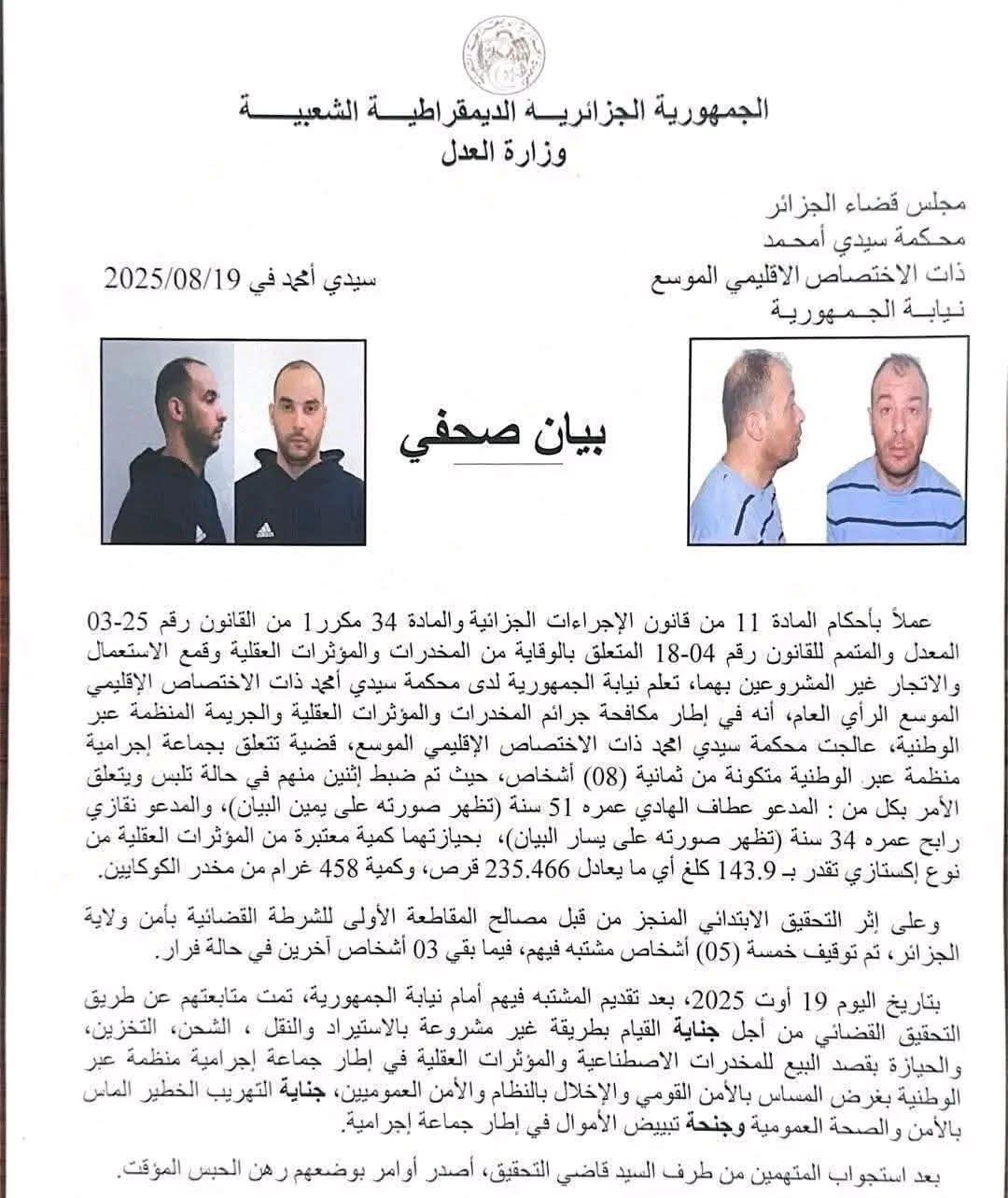 وتابع المصدر: “بتاريخ اليوم 19 أوت 2025 ، بعد تقديم المشتبه فيهم أمام نيابة الجمهورية، تمت متابعتهم عن طريق التحقيق القضائي من أجل جناية القيام بطريقة غير مشروعة بالاستيراد والنقل الشحن التخزين والحيازة بقصد البيع للمخدرات الاصطناعية والمؤثرات العقلية في إطار جماعة إجرامية منظمة عبر الوطنية بغرض المساس بالأمن القومي والإخلال بالنظام والأمن العموميين، جناية التهريب الخطير الماس بالأمن والصحة العمومية وجنحة تبييض الأموال في إطار جماعة إجرامية.”